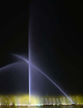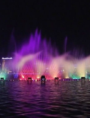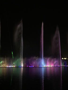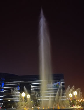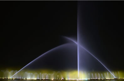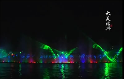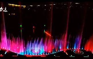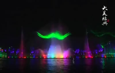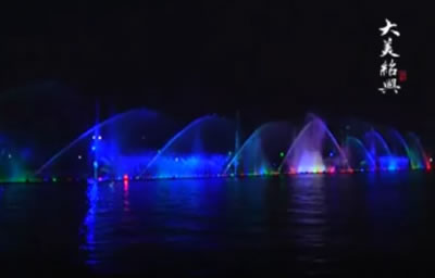 汝州市广成河水生态公园内喷泉总投资1000多万,目前安装调试正式运行,现场播放三段不同的音乐
